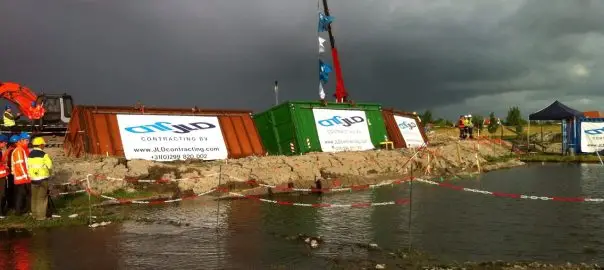 EDAM – Vandaag om 07.14 uur is de proefdijk tijdens 2e containerproef op het testveld van JLD Contracting in Purmerend overeenkomstig de berekeningen gebroken. Hiermee kwam een einde aan bijna een jaar voorbereiding en veldonderzoek. De eerste bevindingen maken het zeer aannemelijk dat de JLD-Dijkstabilisator nog dit jaar uit kan groeien tot een geaccepteerd systeem voor dijkversterking. Een grote stap voor dijkversterking in Nederland en daarbuiten.