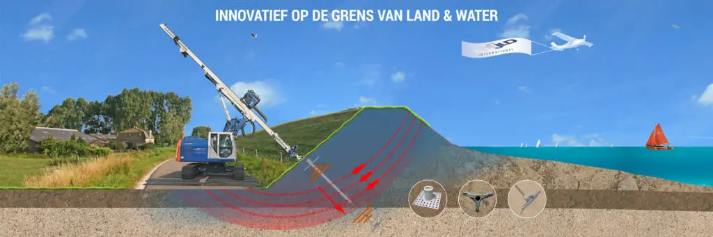 The dike stabilizers, plastic anchor elements, are inserted obliquely into the dike where the extra force is needed. The force of in the dike is monitored twice daily. This is done by linking sensors to a total work force system through Vodafone data technology NB-iot. A total of 700 stabilizers will be installed in the dike. The installation is done with relatively light equipment and has less impact on the environment than piling or vibrating sheet piling or retaining berms. For the surrounding area, it results in less inconvenience. The project, commissioned by Waternet and carried out by JLD Contracting, will be completed in February 2019.