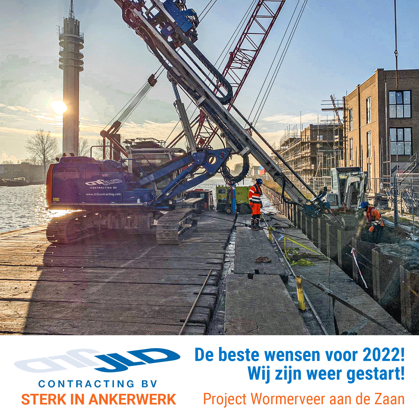 De beste wensen voor 2022! Wij zijn dit jaar zonnig gestart aan de oever van de Zaan in Wormerveer. Daar verankeren wij met onze (blauwe) kraan de damwand met JLD-Klapankers vanaf een ponton. #JLDcontracting #waterbouwers